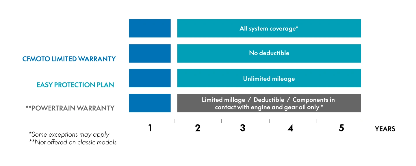 - Honored by all CFMOTO Canada dealers (Original manufacturer's coverage, supported and administered by CFMOTO Canada)